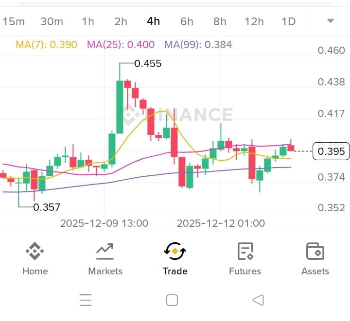 A decisive break above 0.42 would indicate strong bullish momentum, with a potential target of 0.48 – 0.52. Until then, the price is expected to remain range-bound near the resistance levels.
