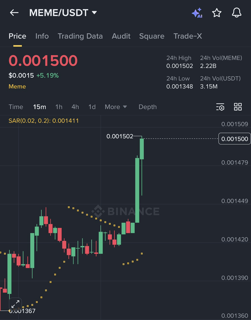 当一种网络迷因币种在单根K线内如此快速上涨时,通常都会出现急剧回调——而MEME已经显露出回调的迹象。 $MEME/USDT 看跌回调形态 MEME触及0.001502后立即遭遇抛售压力,并在顶部留下了回落影线。抛物线转向指标(Parabolic SAR)仍低于价格,但动能过热——这是短期回调后即将迎来下一轮行情的典型形态。 交易设置: 交易设置:做空 入场区域:0.001495 – 0.001505 目标价 1:0.001460 目标价 2:0.001430 目标价 3:0.001400 止损价:0.001525 #MEME #WriteToEarnUpgrade #USStocksForecast2026 {spot}(MEMEUSDT)