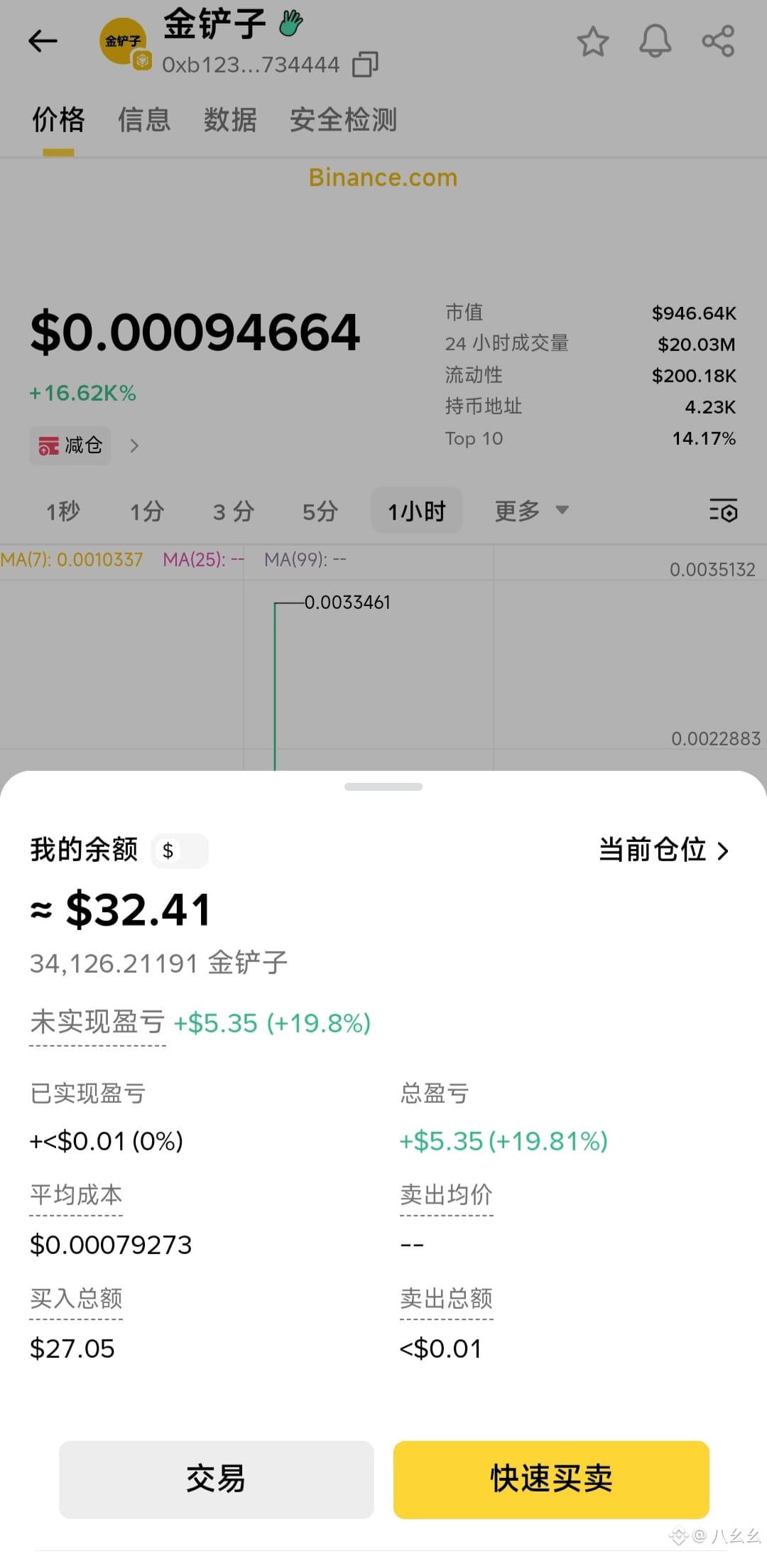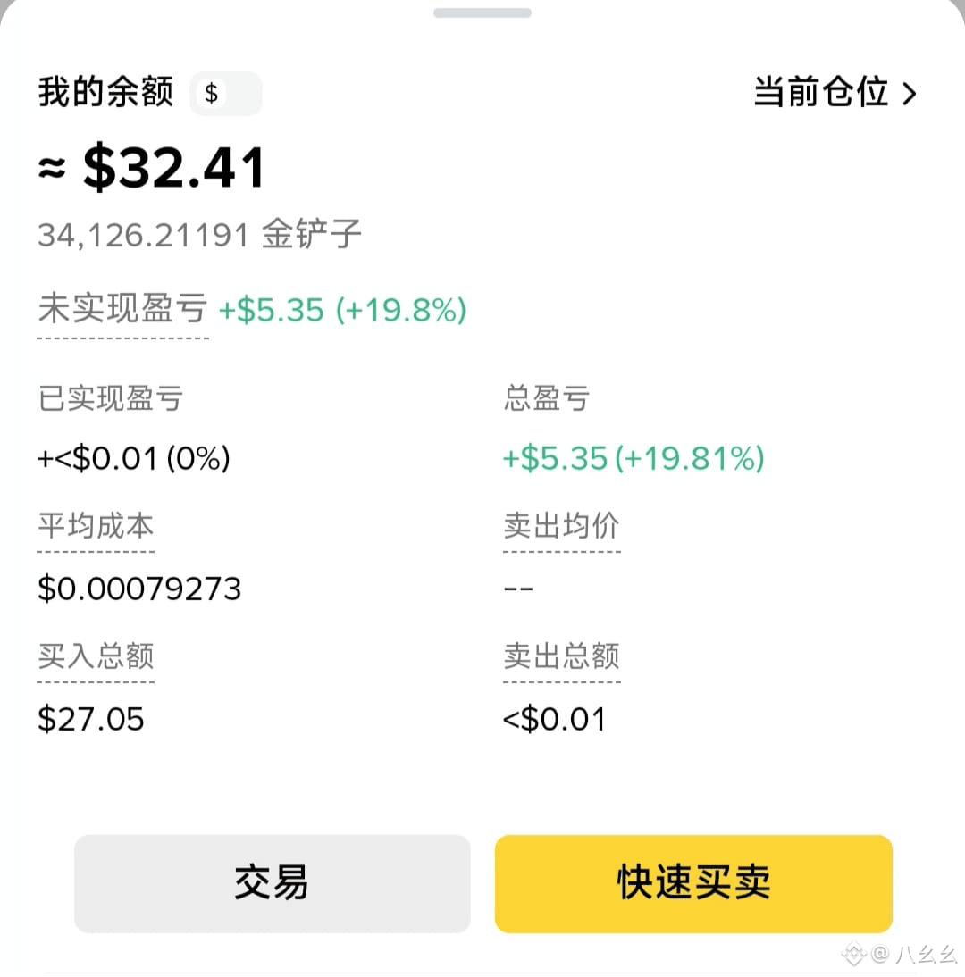 #MEME 又开始打狗了,😂😂😂,韭菜心理,昨晚上看了看meme市场,买了27U的金铲子,哈哈哈哈,一直磨,直接睡觉了,都忘记了,刚刚才想起来,一看,竟然盈利20%,嗯,这次学聪明点,把本来先弄出来。 $H $我踏马来了 $IP