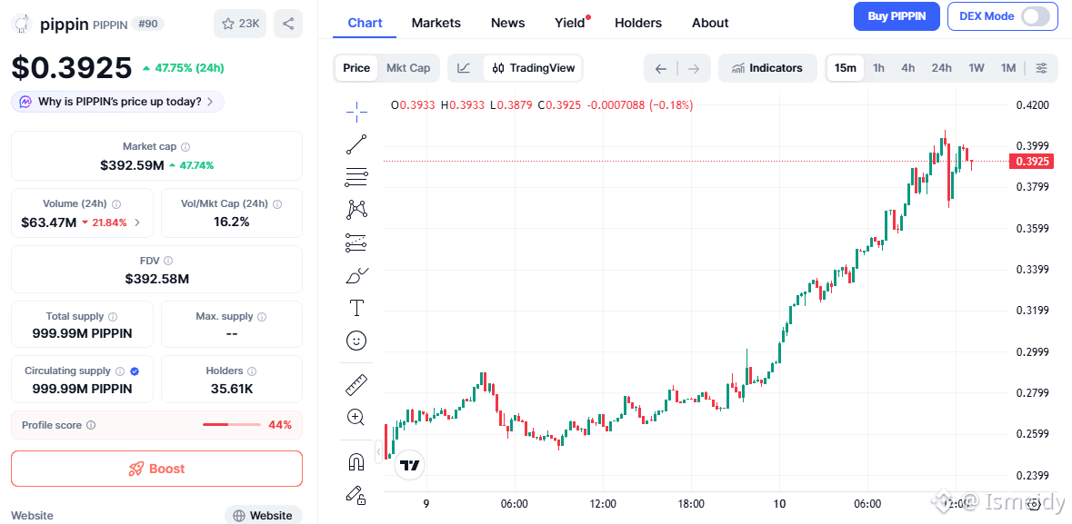 Pippin (PIPPIN) in "Moon": Following the trend of the market, the PIPPIN token has registered a 47.75% increase in value in the last 24 hours, reaching a price of $0.3925 and a market value of $392.59 million.
