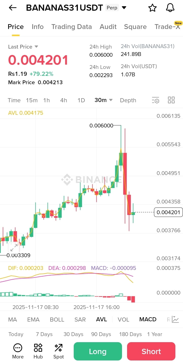 The $BANANAS31 USDT price remained at $0.004201, having surged nearly 80% before pulling back. The spot structure remains bullish, with bullish momentum dominating and bearish pressure gradually weakening. Strong trading volume confirms continued market interest, and further gains are possible after consolidation.