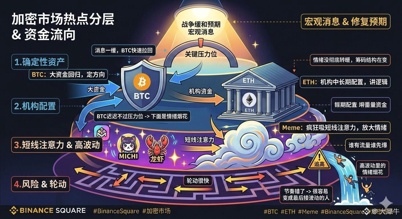 On one hand, after expectations of a de-escalation in the war emerged, $BTC quickly rebounded, indicating that large funds are returning to assets with the highest certainty.