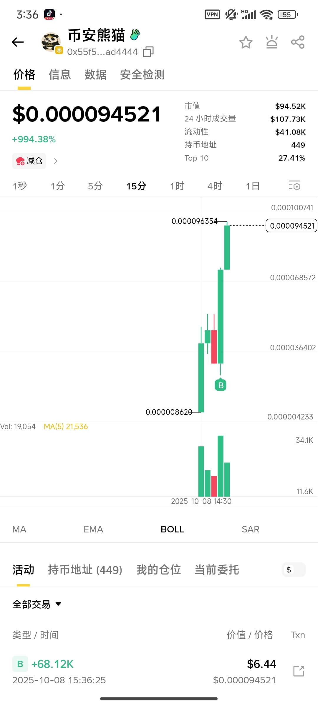 0x55f50b445306a0d76e6f83308acbcd3ac9ad4444 币安熊猫,现在内盘。买的时候3万多的市值,现在9万了。当彩票干点。猛冲。。。 #MEME