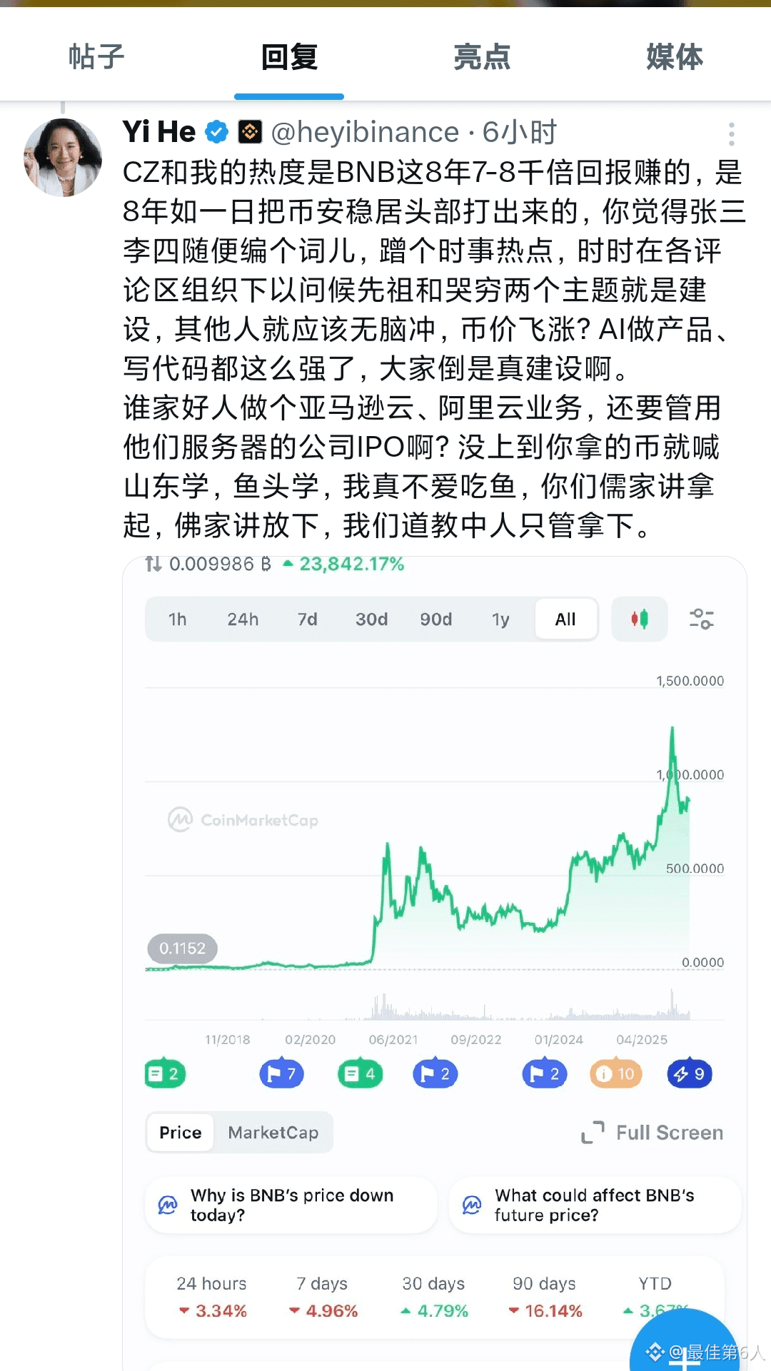 He Yi is absolutely right. You need to be strong yourself to succeed. Binance's current popularity, along with @CZ and @heyi's, is the result of years of consistent building and the seven- to eight-thousand-fold increase in $BNB's value. The same applies to meme coins; they can't rise simply by piggybacking on others' success. Such piggybacking only creates temporary hype and accelerates the exploitation of retail investors by market manipulators. Hopefully, more meme communities that can truly and continuously build their ecosystems will emerge, and hopefully, such communities and memes will be seen and supported by @Square-Creator-788de57bcbfd. $BNB