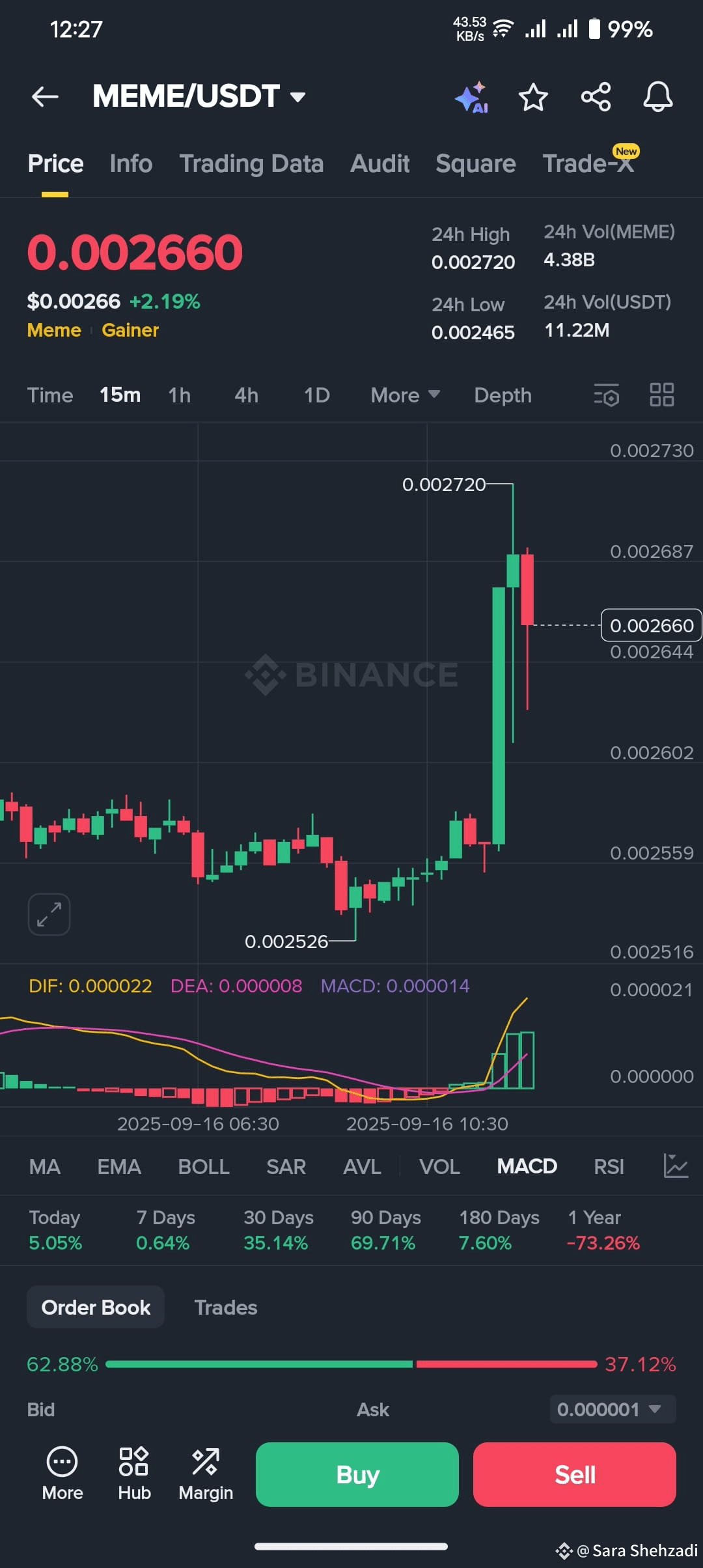 $MEME rebounded from $0.002285 and is currently stabilizing around $0.002675, indicating steady accumulation at support. Buyers are defending this area; a break above $0.002700-$0.002721 could initiate a new uptrend.