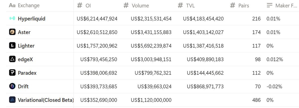 从数据上看三强基本确定 三强遥遥领先 Lighter发币以后大概率TVL会到第二 asterTGE以后各方面数据都表现很不错也增长迅速 被人诟病都OI数据也很不错了 Lighter从开始一直跟到现在 虽然错过了hype 但是我抓住了lighter跟aster 也算很不错了