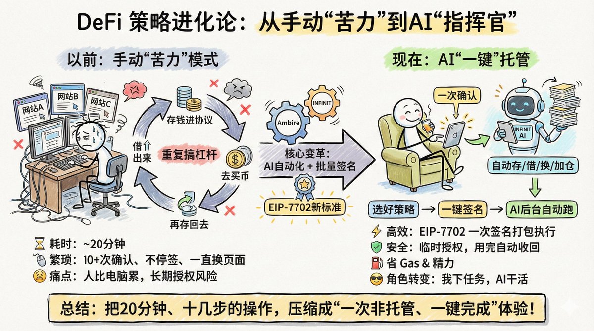 以前我做一次 DeFi 策略, 要开好几个网站、点十几次确认, 弄完差不多二十分钟,人比电脑还累。 那种经典玩法你肯定懂: 先存钱进协议 → 再借出来 → 再去买币 → 再存回去 → 重复几轮搞杠杆收益。 听着专业,操作就是:不停点、不停签、一直换页面。 Ambire 跟 @Infinit_Labs 集成之后,这事变了。 现在的流程变成: 我在 Ambire 里选好策略, 点“一次确认”, 剩下的存、借、换、加仓,全由 INFINIT 的 AI 在后台自动跑。 以前是我当“苦力”, 现在是我下任务,AI 去干活。 更妙的是 Ambire 上了以太坊的新标准 EIP-7702: 原来十几笔交易要十几次授权, 现在可以一次签名打包执行, 而且是“临时授权”,这次用完权限自动收回。 两个直接好处: 一是省 Gas——中间少了很多重复操作; 二是更安全——不再到处留着长期授权的“雷”。 对我这种经常折腾策略的人来说, 最明显的变化就是: 以前做一套策略要专门抽时间, 现在就是——设好参数,点一下,剩下交给 Ambire + @Infinit_Labs。 说白了,这次合作干的事就是一句话: 把原来 20 分钟、十几步的 DeFi 操作, 压缩成“一次非托管、一键完成”的体验