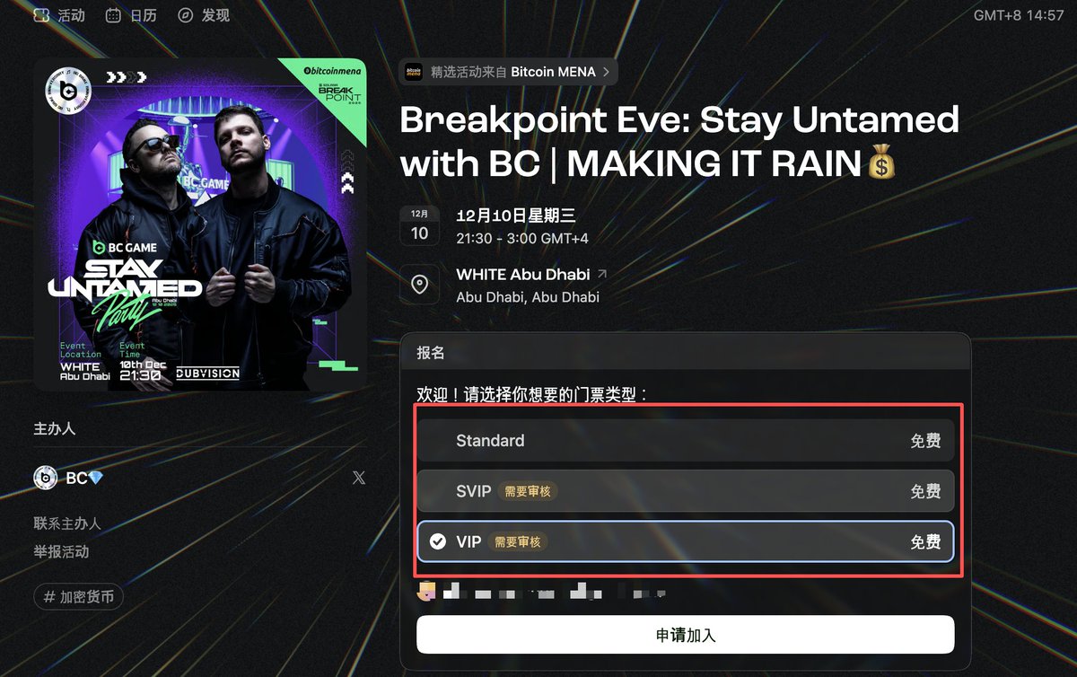 刚刚看到BCGAME @bcgame 的新活动。冲了! 100u门票免费送只需要去申请等审核就行。 最近在迪拜的兄弟们一定要申请一下,就在阿布扎比10号活动开始。邀请了排名女DJ百大。还有很多币圈顶流们 又可以出去见世面了😍#BCGAME 门票传送门: