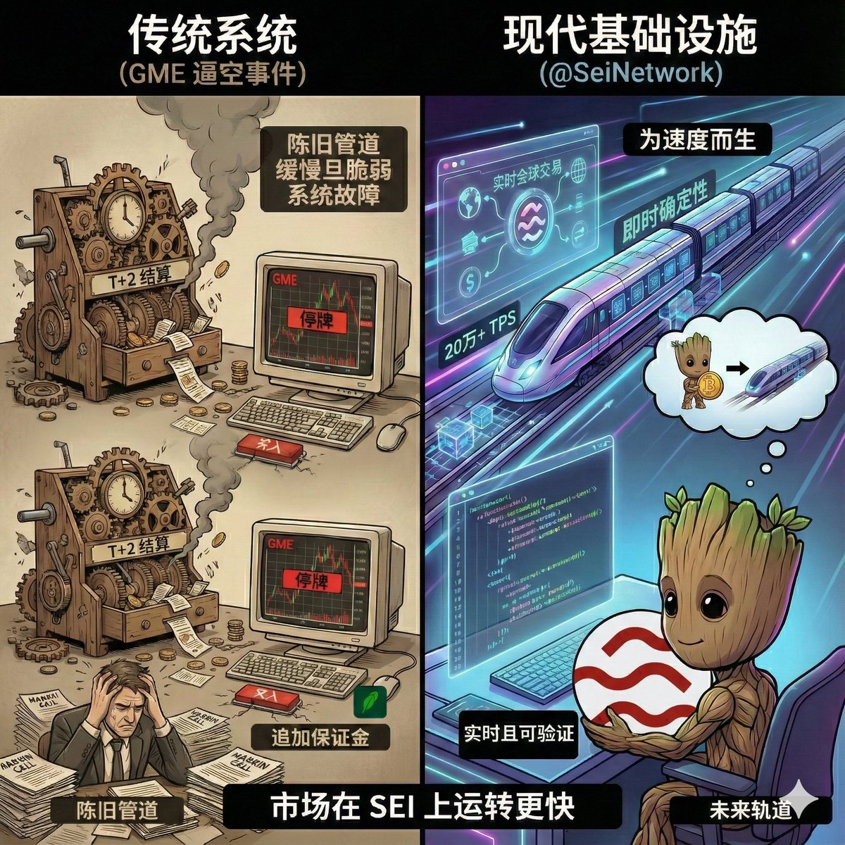 以前看 GME 那波,我跟大家一样,只会骂 Robinhood 为啥“只让卖不让买”。后来才知道,后台那几天如果不停盘,平台要往传统清算机构压上好几倍身家的保证金,老金融那套结算系统,根本扛不住这种全网一起冲的节奏。 当时在一线写代码的人,有人真的把这个坑记在了心里。 他就是@jayendra_jog现在的 Sei Labs 联合创始人之一。 别人看 GME,看的是爽文剧情; 他看的是底层现实: 前台市场已经是实时、全球、手机一点就能下单, 底层结算还停留在上个时代,慢、笨、又费钱。 所以后来有了这条路:与其继续给老系统打补丁,不如干脆重做一条为“现代市场”生的链,这就是今天的@SeiNetwork。在我眼里,Sei 最大的牛点不是一句“高 TPS”就能概括的,而是几件很朴素、但很难做到的事: 从第一天起,就按“链上华尔街底层机房”去设计,而不是一般公链那种啥都想做一点 把“实时结算、可验证执行、全球用户都能接”的这一整套,当成刚需而不是选配 性能目标直接往二十万级 TPS 打,是真的给未来几十年的市场留空间 你可以不懂那些技术细节,但有一点很好懂: 如果当年 GME 那样的极端行情,跑在传统结算系统上,就只能被迫按暂停; 而放在 Sei 这种为“现代市场”重做过一遍的底层上,它生来就是为这种速度准备的。 所以我现在提 @SeiNetwork,不再只是说“性能强”“交易快”这种空话。 对我来说,它更像是那群亲眼见过老系统极限的人,咬牙从零重来后的答案。 市场只会越来越快, 而 Sei,就是那条敢接住这个速度的轨道。 Markets Move Faster on Sei.