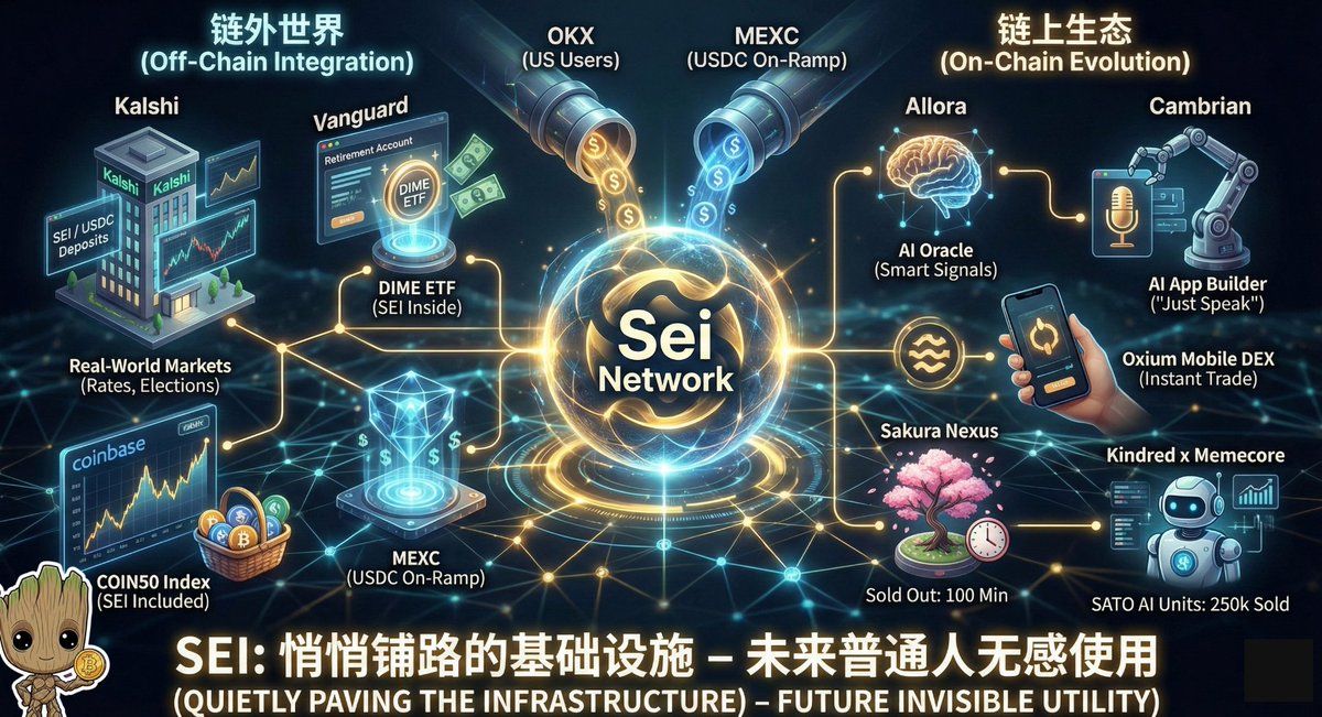 我躺在床上翻这周 @SeiNetwork的动态,本来想“随便看看”,结果越看越清醒:这链这一周,干的都是升级人生配置的大事。 先是圈外那一部分:Kalshi 直接把 SEI、USDC 充提开在 Sei 上,web2的事都搞进去了,比如利率、选举这些,开始真正在 Sei 上变成可以交易的市场;Vanguard 弄 DIME ETF,把 SEI 悄悄塞进普通人养老账户里;Coinbase 的 COIN50 指数也把 SEI拉进“头部资产篮子”。再加上 OKX 给美国用户单独搞活动、MEXC 开 Sei 上 USDC 直存直提,等于把钱从场外拉进来的路,一条一条铺好了。 链上呢,就是把“怎么用”这个问题往死里优化。Allora 给 Sei 接上动态 AI 预言机,帮你用智能信号做决策;Cambrian 直接上“AI App Builder”,一句人话就能在 Sei 上生成应用;Oxium 把原生 DEX 搬进手机,想交易直接掏手机点两下。再往生态里看,Sakura Nexus 创世 NFT 100 分钟卖光,Kindred 搭配 Memecore 卖出 25 万个 SATO AI 牛逼 我刷完的感觉特别简单: 之前我看 @SeiNetwork,是“这条链上有没有赚钱的机会”;现在更像是——这条链已经在悄悄往“基础设施”那条路走了,让我想到了一句话,「流水不争先,争的是滔滔不绝」 等哪天普通人买 ETF、用应用、玩游戏,根本不知道背后是 $Sei ,那大概才是这周这些新闻,真正的意义。现在看到的,只是刚刚开始!