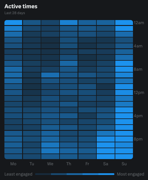 下午5:00到凌晨2:00是大家最活跃的时间。 看来大家都熬夜不舍得睡。 周日全天活跃我能理解。 周六白天你们都干啥去了? 难道周六也要上班?