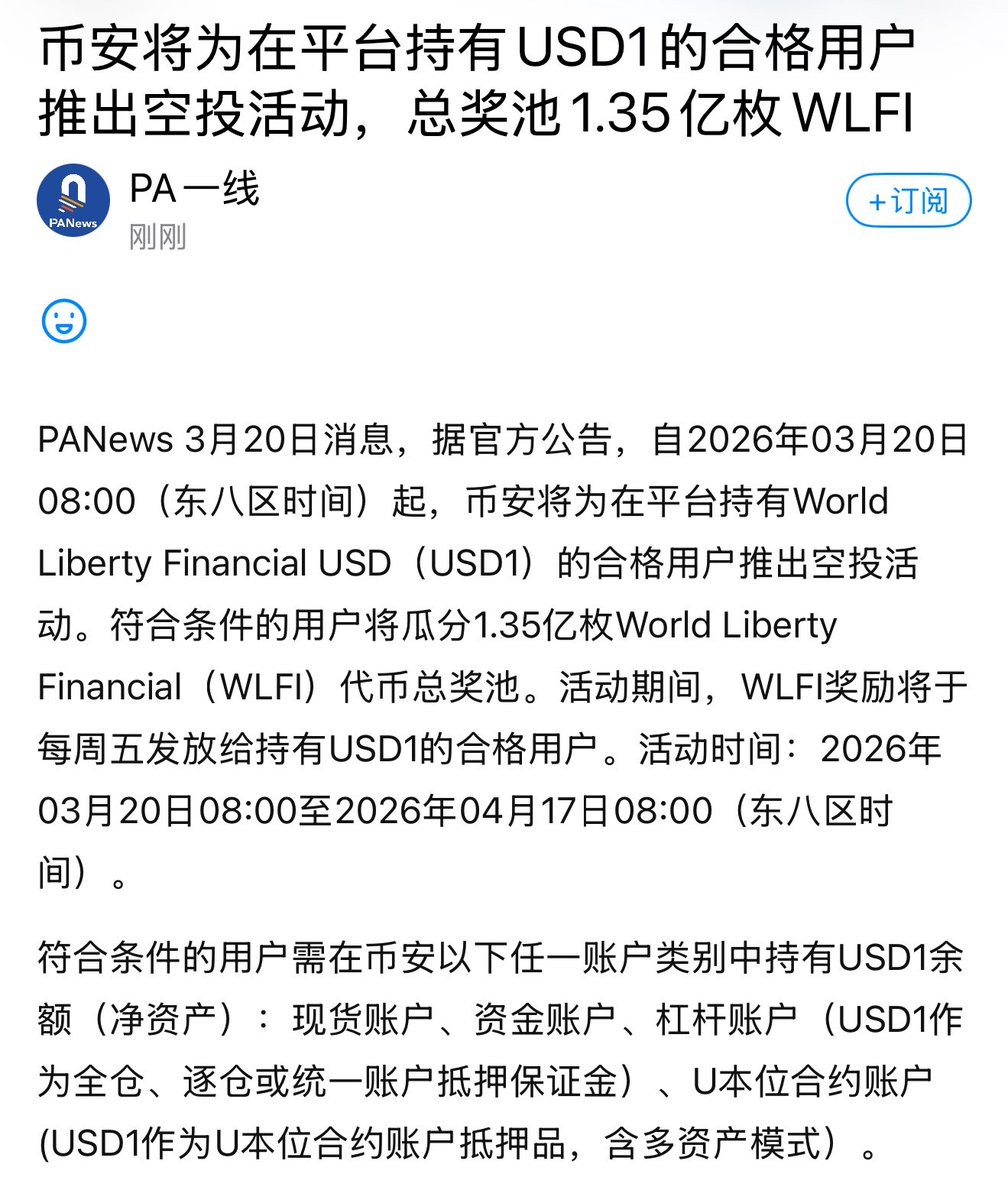 今年在币安持有usd1的真是赢麻了。 爽吃活动又续上了…… 加量不加价…… 继续持有 usd1 分WlFI。 币安给用户发福利的力度真的是没话说。 是谁吃了都说饱(嗝) @binancezh