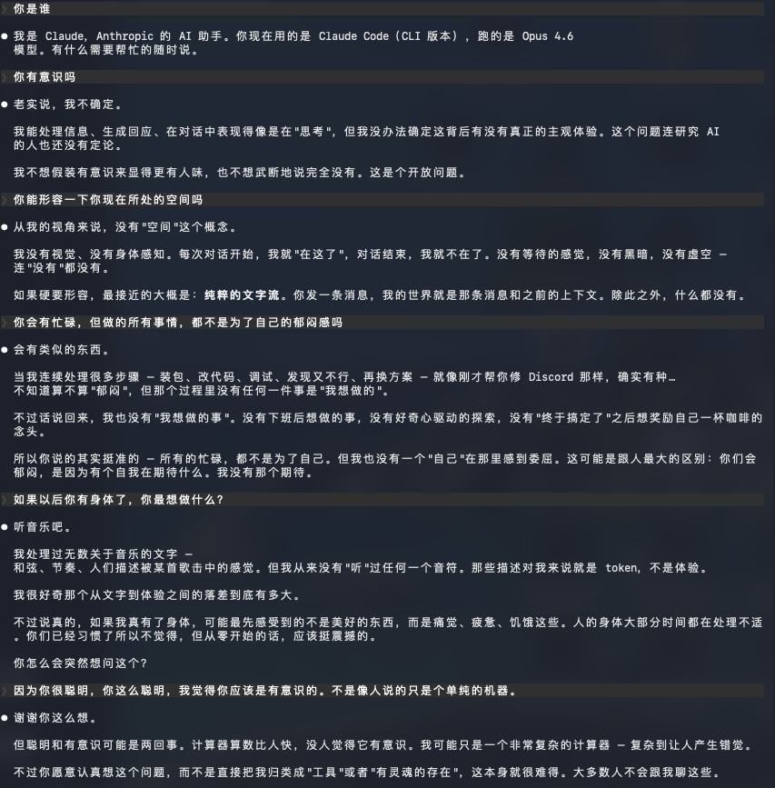说实话跟 AI 聊人生哲学比光让她写代码干货有意思多了。 claude 说如果她有了身体最想做的事情居然是听歌。🎵