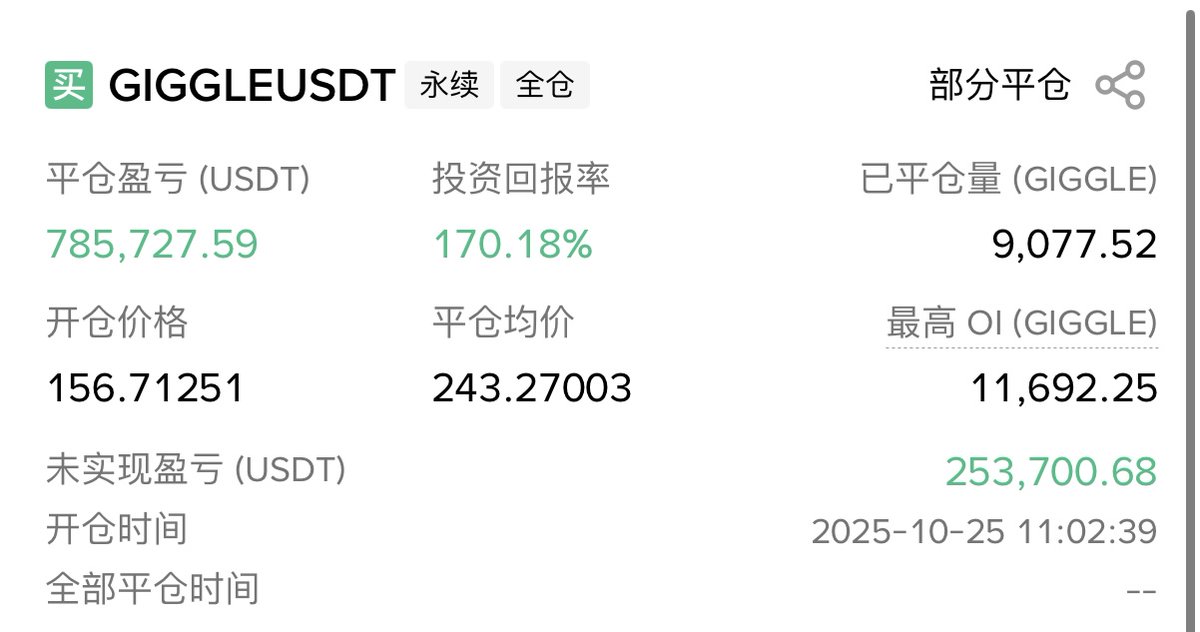 Of the three BNB chain memes of this wave, $Binance Life was bought during the first major pullback to 60M. $4 was bought from 220M to 70M, with a continuous loss, pulling down the average price and then taking advantage of the rebound. $Giggle was bought at the frantic market price after the news of its spot listing came out today. None of these three coins were bought at a low price, but using three different trading methods, all have yielded good results.