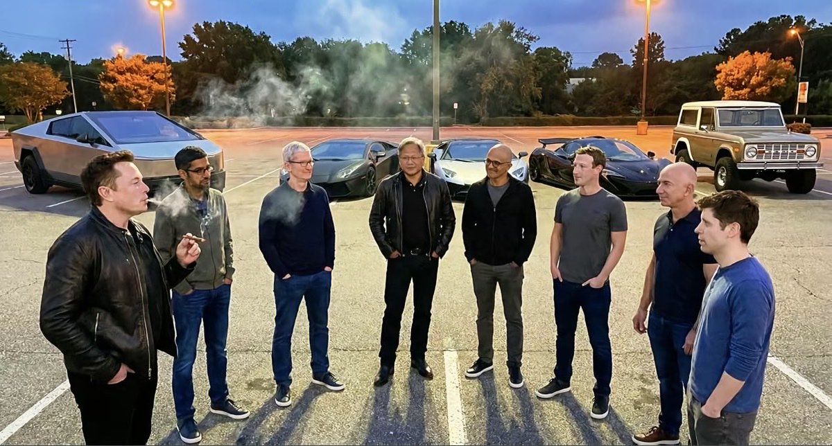 这张图片对我来说有很强的能量场,再配上一首气势磅礴的歌曲,满满的能量。 特斯拉CEO,谷歌CEO,苹果CEO,英伟达CEO,微软CEO,脸书CEO,亚马逊CEO,Open AI CEO