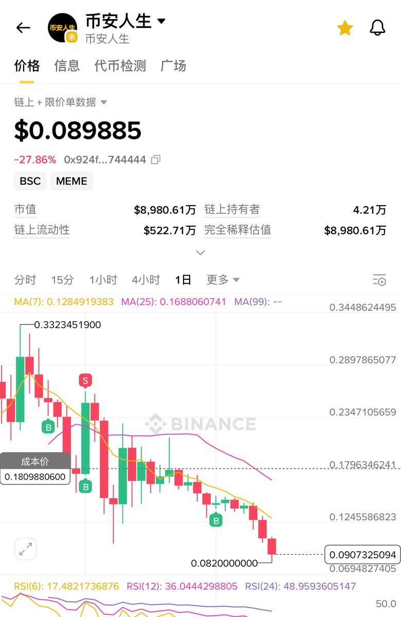 币安人生,彻底跌破一亿新低。想想前几个星期,每到周五,就有一堆人加仓 $币安人生 和各种中文meme,然后迎来一波反弹。 期待周六能像 $giggle 一样上线现货。哪怕没真的上,也不重要——因为真正被炒作的,是上现货的预期,而不是现货本身。 结果现在二圣不提了,现货也一直上不去,随着市场越来越冷。中文概念的热度也在逐渐消散,没人修仙了,也不客服小何了,帕鲁更是跌到了20W市值 我的币安人生难道要止步于此了吗