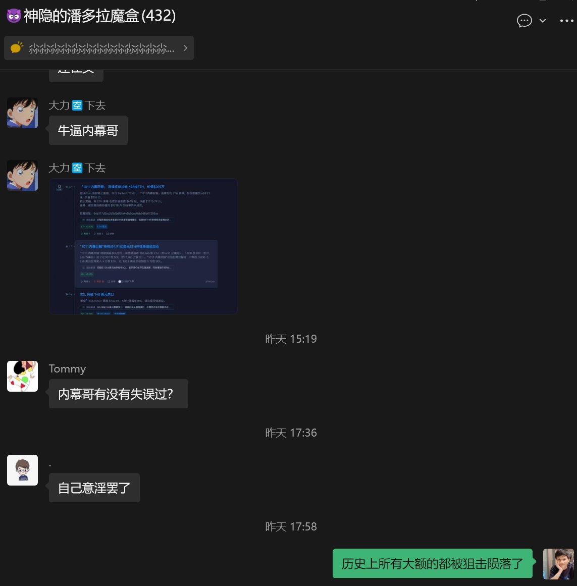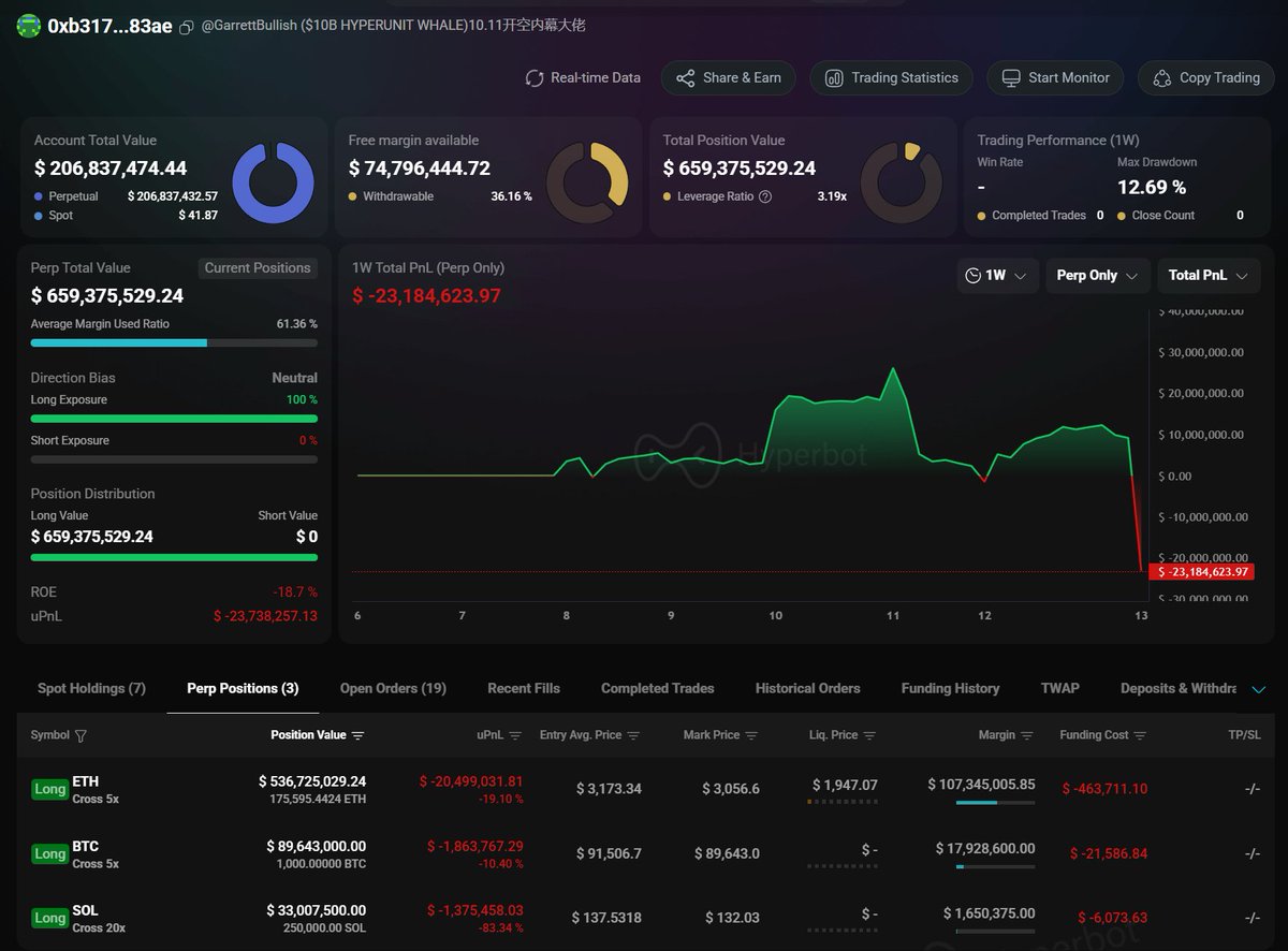 10.11开空赢麻的这个内幕哥在前两天疯狂加仓以太多单,包括昨天还在追多,引发不少人跟操 目前已经从赢麻到亏麻,浮亏2300多万美金,一个多亿人民币 #内幕哥 历史上所有大额的都被狙击陨落了 这次内幕哥不知道下场如何,不过也有人说是特朗普家族的地址 监测via @Hyperbotai