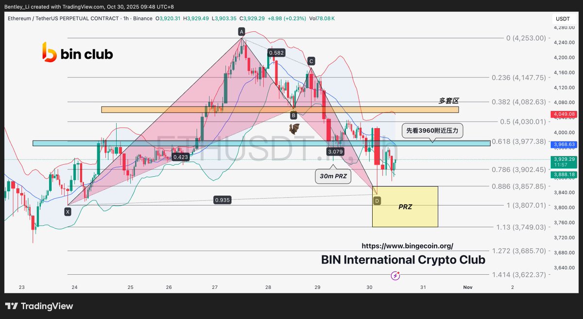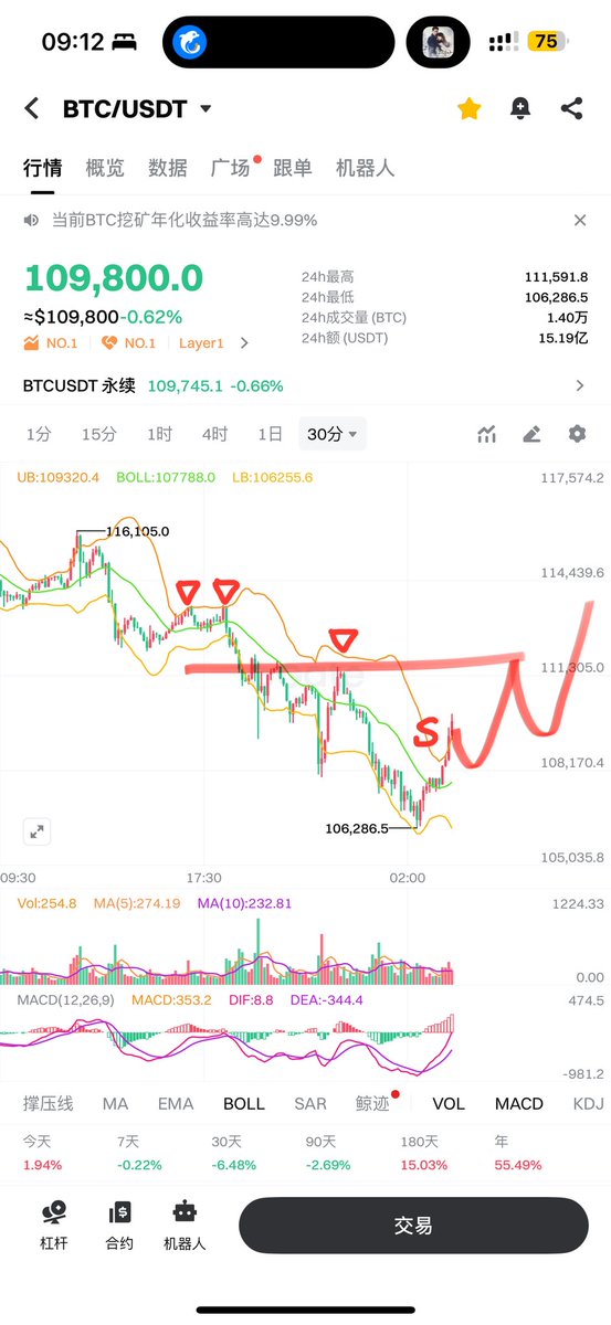 - Next, look at the 30-minute Bollinger Band. From 116k to 106k, including a large rebound, it couldn't break the upper band. A breakout can be seen as a reversal signal, but a valid breakout above 112k is a sign of consolidation.