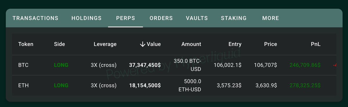 今年对我获取信息影响最大的 2 个产品:Hyperliquid 和 Polymarket 在 Hyperliquid 上看巨鲸对目前价格的行为: Long or Short 在 Polymarket 上看散户对目前价格的投票: Above or Below 如果有人基于这 2 个平台做出一款信息产品,应该会很有趣 @mdzzi 巨鲸开仓地址 据 @mlmabc 称资金量有 100B+