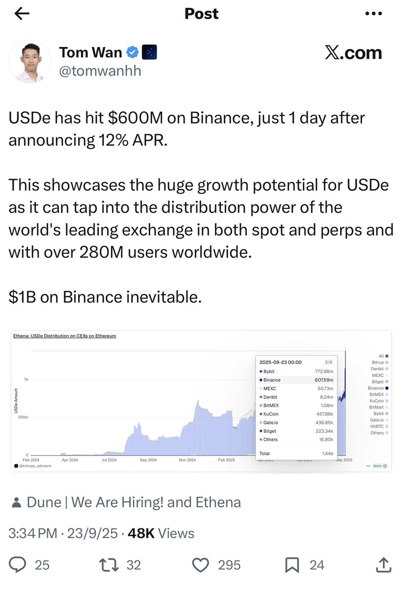 1. Binance launched a limited-time user acquisition campaign, offering a 12% annualized yield on USDe, while allowing USDe to be used as collateral, treated the same as USDT and USDC, with no effective limits.