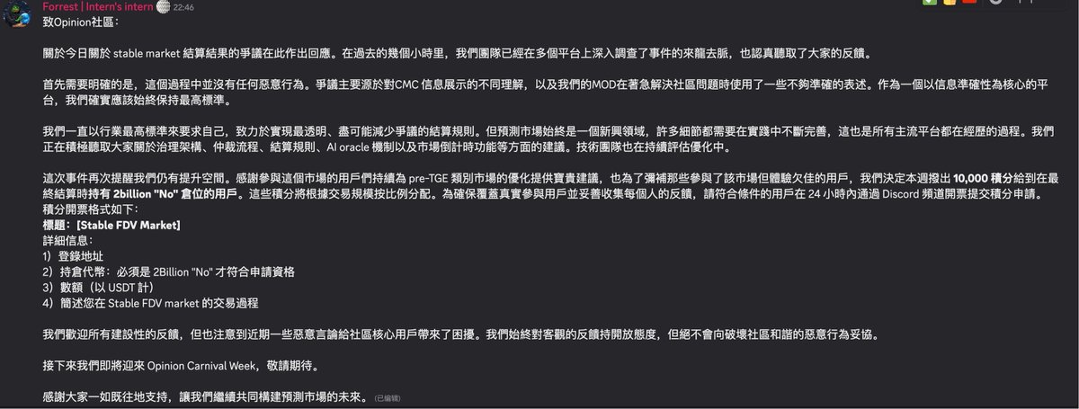 This incident serves as a reminder that there is still room for improvement. Thank you to all users who have participated in this market for your valuable suggestions on optimizing the pre-TGE category market. To compensate users who participated but had a poor experience, we have decided to allocate 10,000 points this week to users holding a 2-billion "No" position at final settlement. These points will be distributed pro rataly based on trade size. To ensure coverage of genuine participants and to properly collect feedback, eligible users are requested to submit their point applications via Discord channel invoicing within 24 hours.