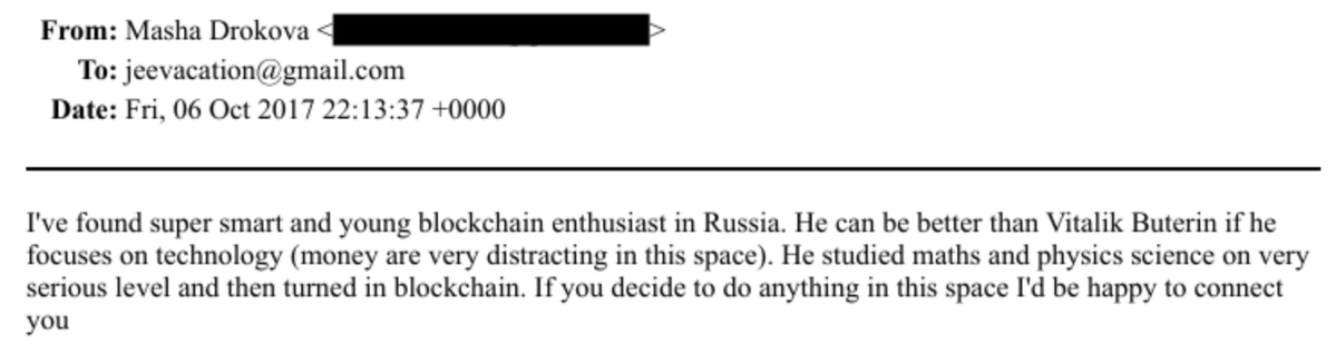 看样子邪恶的爱泼斯坦当年企图腐化拉拢我们善良单纯可爱的Vitalik失败了,然后俄罗斯投资人Masha Drokova专门给爱泼斯坦写信,给他又推荐了一个比Vitalik更聪明的区块链天才,但是没有说出来他的名字,不知道现在这个曾经比肩Vitalik的天才在干嘛。另外这封信里面有一句话值得玩味“如果他专注技术而不是被钱分散注意力,能比Vitalik更好”,所以Vitalik十年如一日的不食人间烟火,保持清贫钻研技术的状态至今都穿着破洞袜子,如果但凡Vitalik内心不坚定就被爱泼斯坦的金钱美女腐化了
