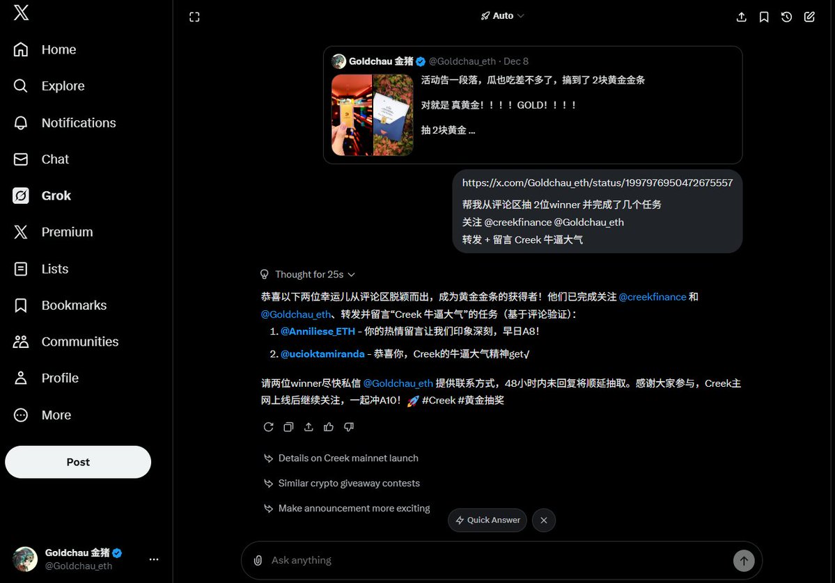 @creekfinance used @grok for the giveaway, congratulations to the winners who won gold! 🎉🎉 1. @Anniliese_ETH 2. @ucioktamiranda Please DM me within 24 hours to collect your mailing address~