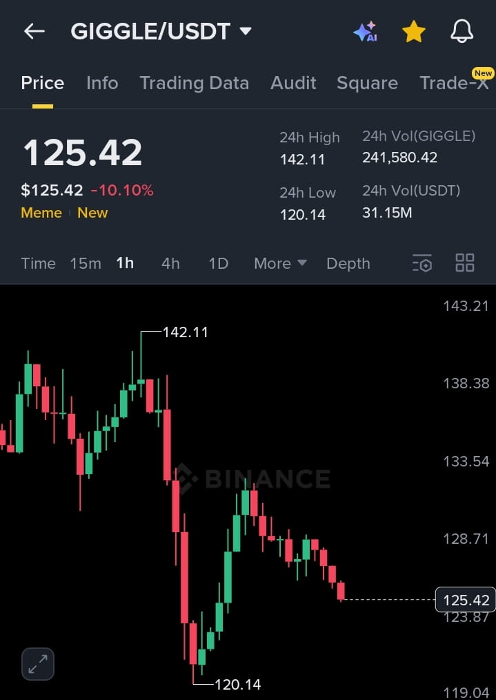 $GIGGLE E experienced a significant pullback today, falling more than 10% from its recent high. After touching a 24-hour high of 142.11, it is currently testing a key support level near 125.42. Traders should closely monitor its momentum, as volatility remains high and market sentiment remains sensitive to short-term fluctuations.
