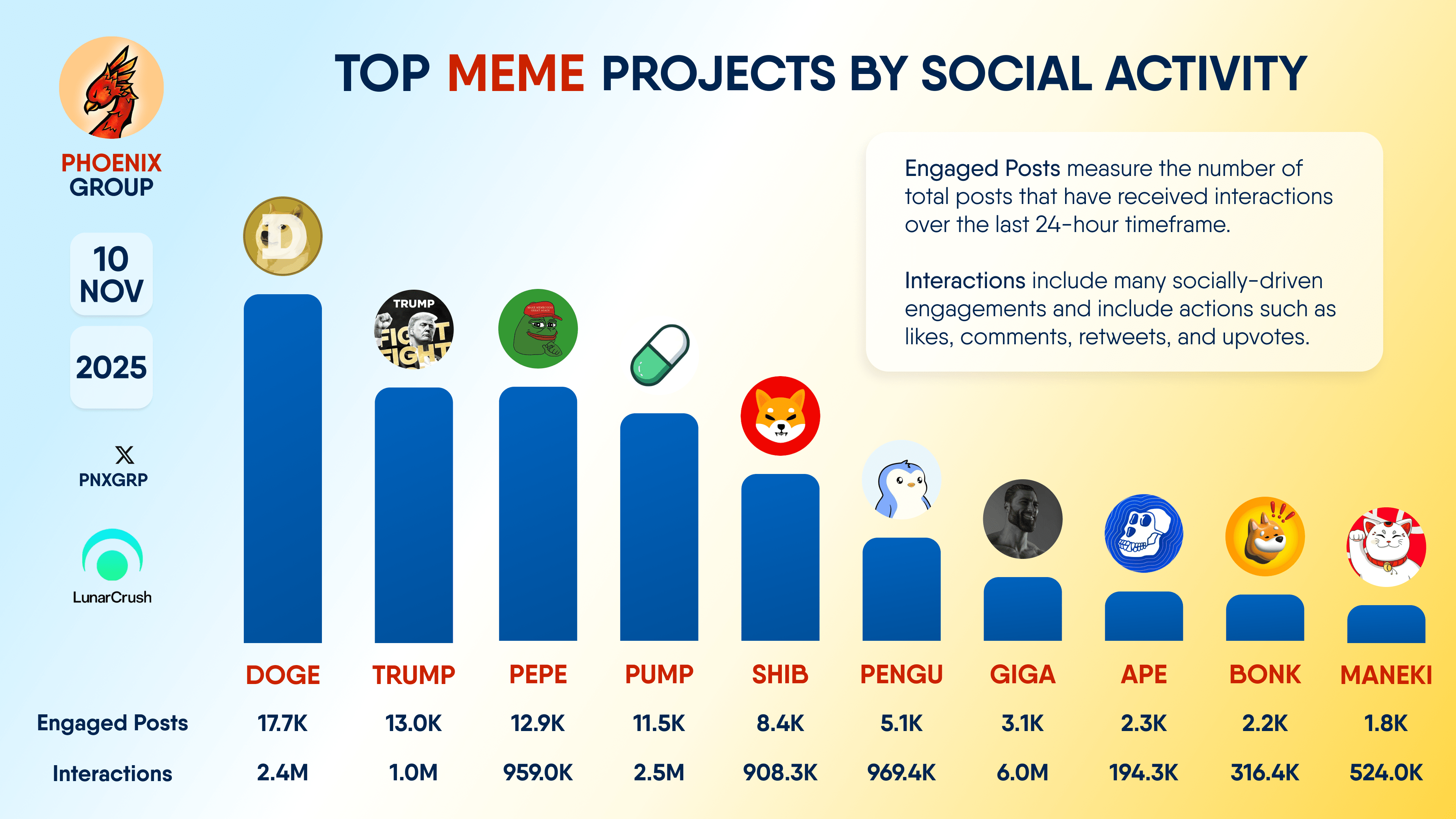 The most active and popular #MEME projects on social media: $DOGE $TRUMP $PEPE $PUMP $SHIB $PENGU $GIGA $APE $BONK $MANEKI