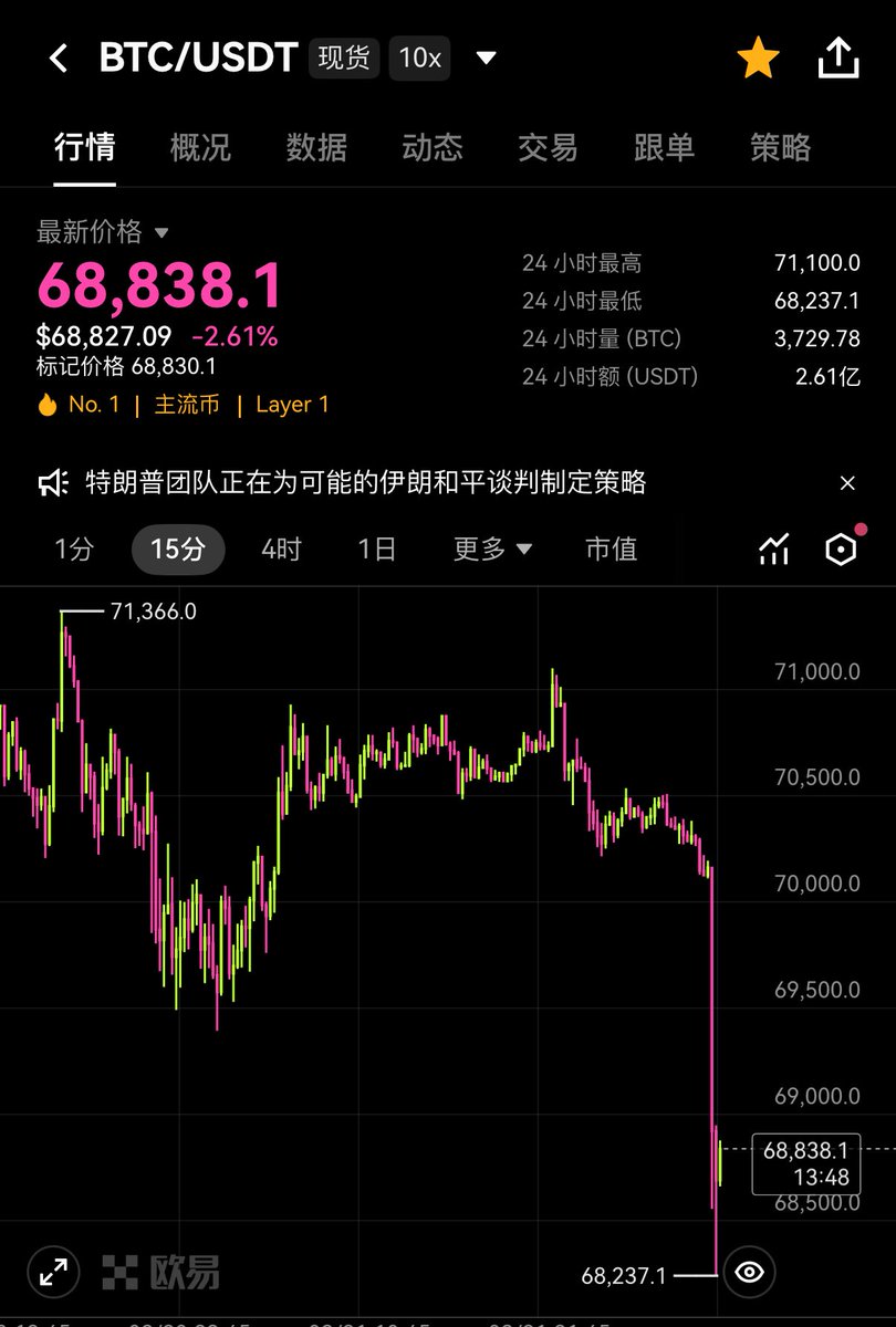 突发!特朗普威胁伊朗说: “如果48小时内不开放霍尔木兹海峡,我就把你们的发电厂都轰炸了!” 伊朗怕不怕我不知道,反正 BTC 应声跌破 7w! 但是特朗普这个嘴,大家也知道,一怒之下,就怒了一下,最后还是 Taco!
