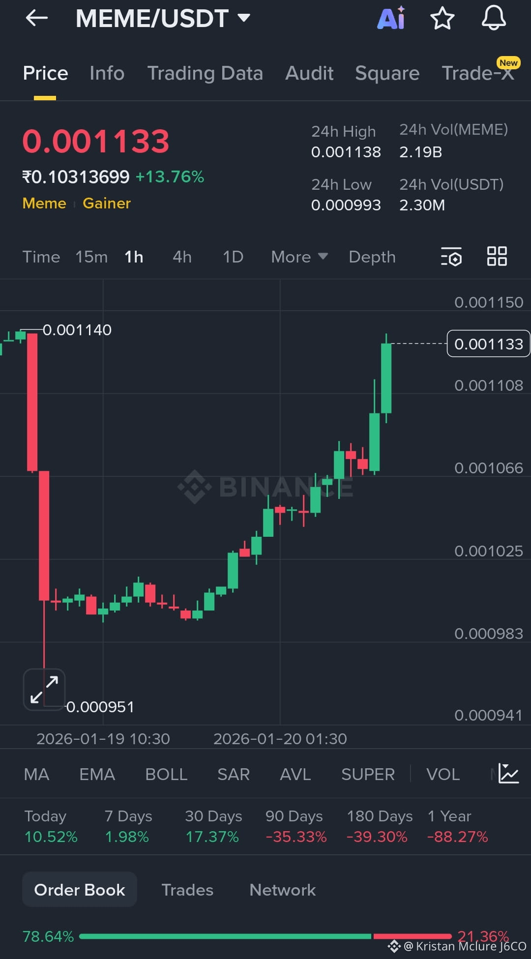 🚀 $MEME — Strong bullish reversal with strong follow-through. MEME is currently trading around $0.001133, up 13.76% after a strong rebound from the demand zone of $0.000951. The price has formed a clear V-shaped rebound, the short-term structure has turned bullish, and a new high has been made on the 1-hour chart. 📈🔥