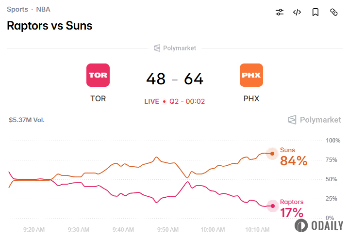 The NBA regular season game between the Raptors and the Suns started at 9:00 AM Beijing time this morning and is currently in halftime. The current score is 48:66, with the Raptors trailing by 18 points. The price is currently quoted at 17¢.
