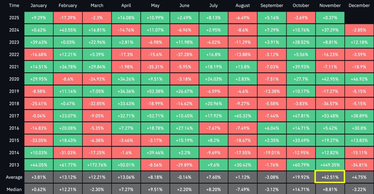 比特币10月份收跌——这种情况虽然罕见,但并非终结。 现在迎来11月,历史上比特币表现最佳的月份。 平均收益率:+42.51% 历史会再次重演吗?
