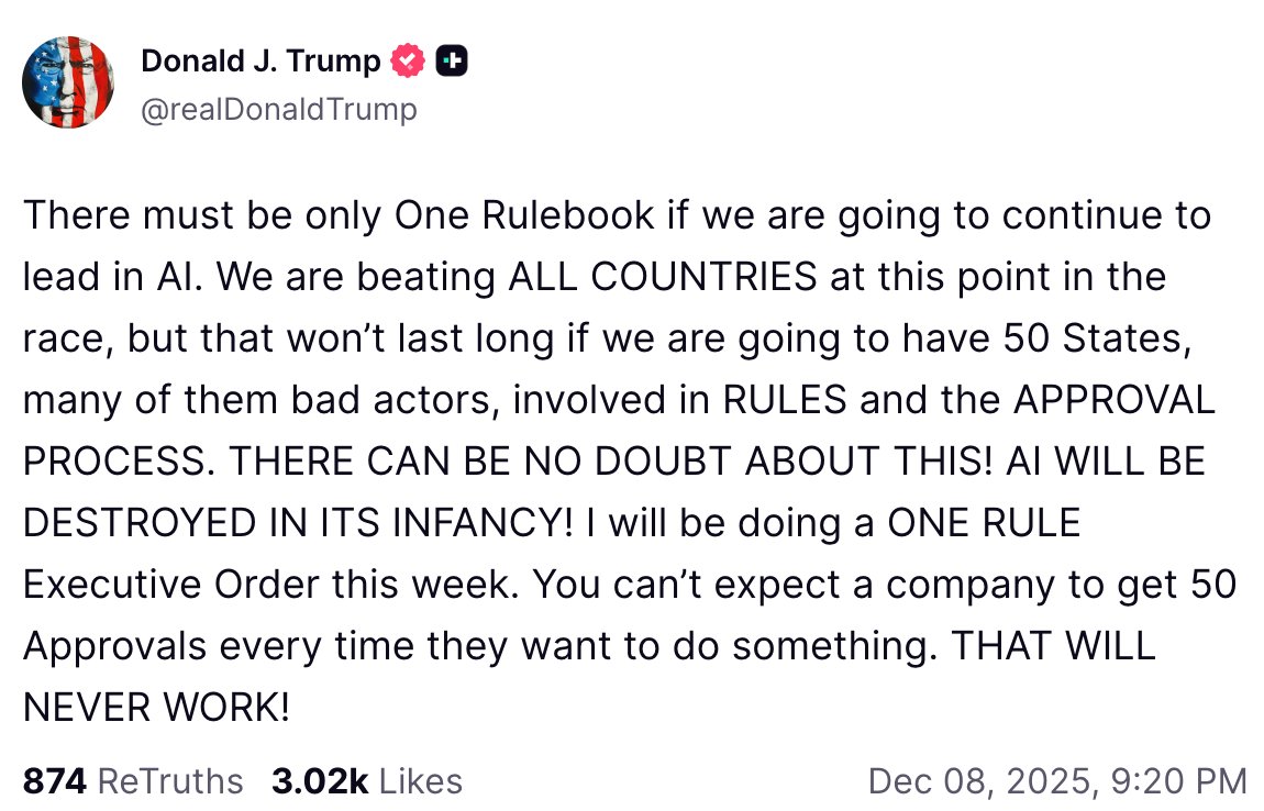 特朗普表示,将在本周签署一项与AI审批程序有关的行政命令,以避免美国各州制定不同的规则妨碍AI发展。 “如果我们要在人工智能领域继续保持领先地位,就必须只有一套规则......我将在本周发布一项‘单一规则’行政命令。你不能指望一家公司每次想做什么都要获得50个州的批准。”