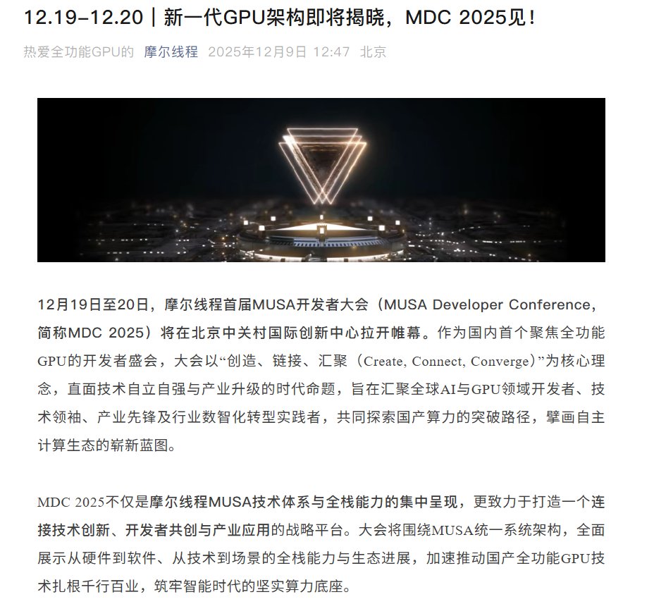 摩尔线程预告即将发布新一代GPU架构,12月19日至20日举办首届MUSA开发者大会。