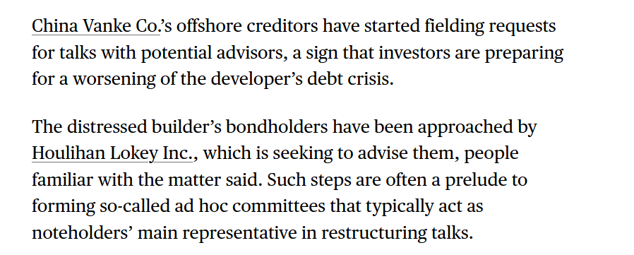 彭博:万科海外债权人已开始接受重组咨询机构Houlihan Lokey(华利安)顾问进行会谈的请求,此类举措通常是组建所谓“临时委员会”的前奏,临时委员会通常代表债券持有人利益与债务方谈判。 知情人士透露,如果万科海外债券违约,债券持有人谈判筹码主要依赖 “维好条约” 和清算香港子公司。