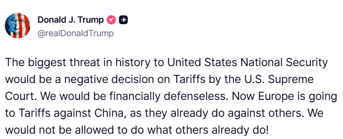 特朗普为关税辩护:“正是因为关税的便捷与快速实施,我们的国家安全才得到极大增强,我们也成为了当今世界金融实力最强的国家。只有那些阴暗邪恶的势力,才希望看到这一切终结!” “对美国国家安全最大的历史性威胁,将是美国最高法院就关税问题作出的不利裁决。届时,我们在经济上将毫无防御能力。”