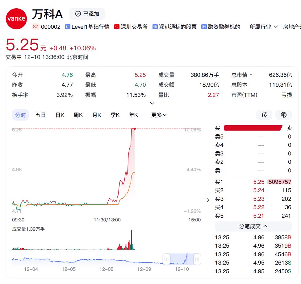 #行情 万科AH股午后拉升,万科企业涨超13%,万科涨停。