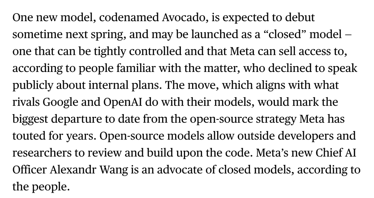 彭博社报道称,扎克伯格在组建科技史上最昂贵的团队之一数月后,开始亲自参与日常工作,并将公司的重心从开源模型转向可以盈利的闭源AI模型。 Meta明年将推出代号“Avocado(牛油果)”的闭源新模型,与OpenAI展开竞争。Meta新任首席人工智能官 Alexandr Wang(汪滔)是封闭式模型的拥护者。