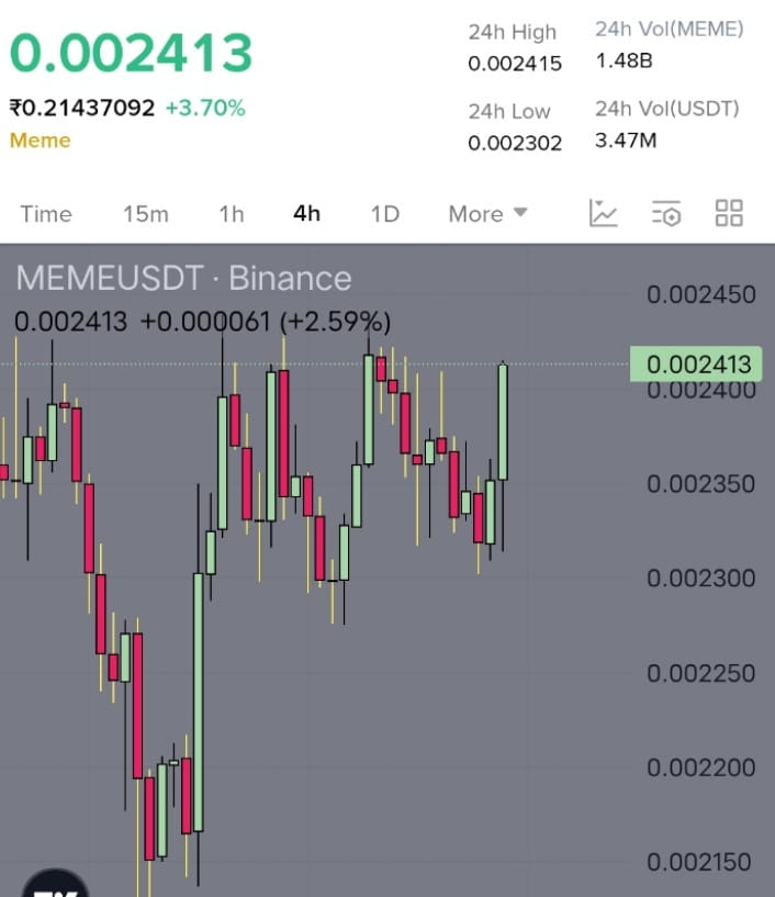 $MEME Timeframe: 4 hours Signal Type: Buy $MEME Entry Range: 0.002350, 0.002410 Target 1: 0.002500 Target 2: 0.002600 Target 3: 0.002750 Stop Loss: 0.002250 $MEME #MEME #MemeWatch2024 #MarketRebound #BinanceHODLerFF #BinanceHODLerEDEN