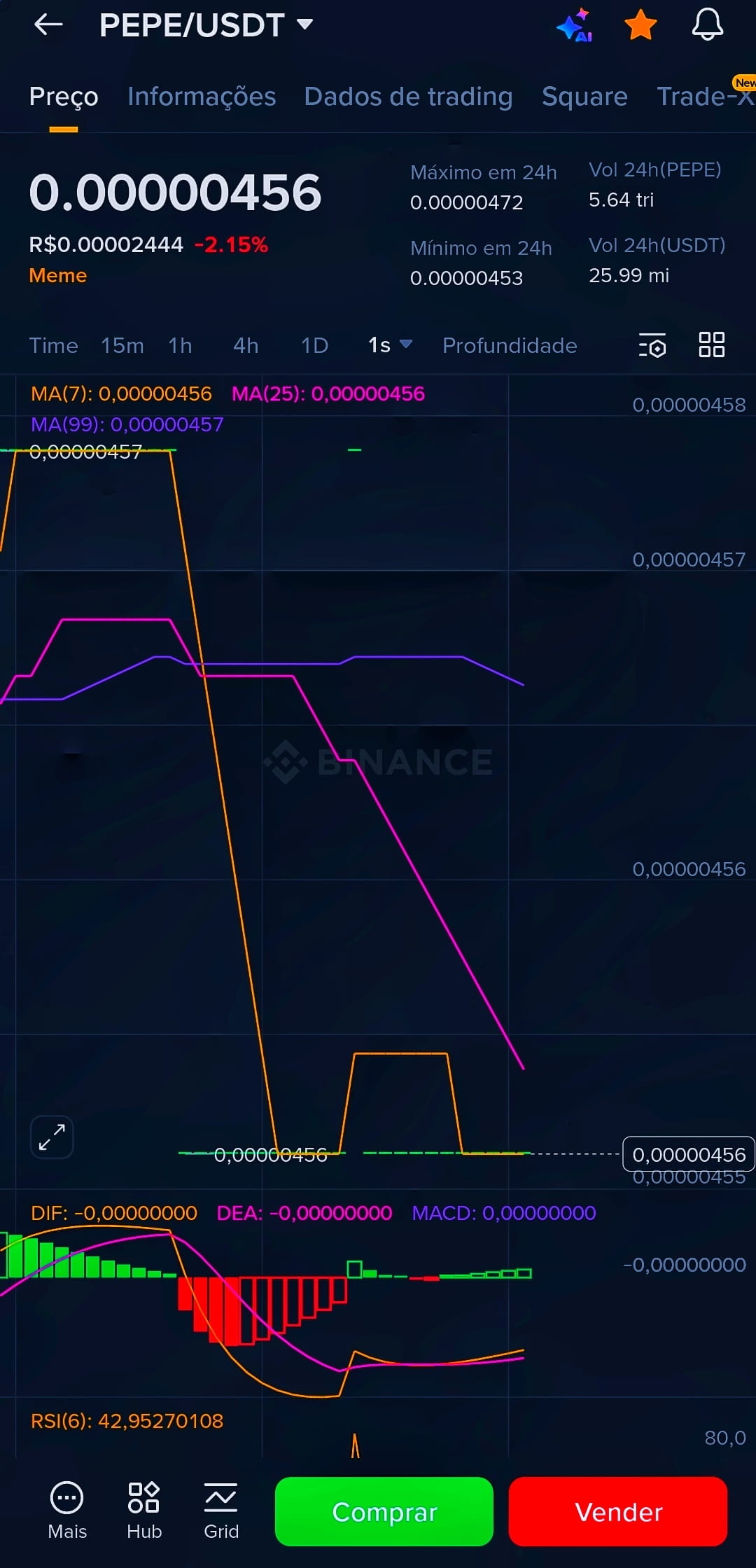 快速结论:我们已经看到了当前趋势,并支持/稳定了 0.00000456,符合媒体行动的指示。 O 卷是中音 (Vol 24h: 5.64 tri PEPE),indicando interesse no nível de preço atual。