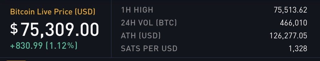 👀……密切关注事态发展👇 比特币价格突破 75,000 美元 ✅