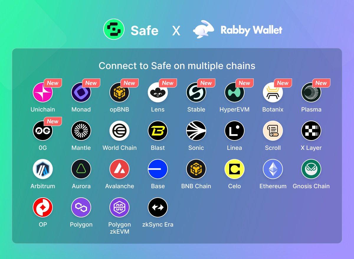 Rabby now supports @safe wallets on Unichain, Monad, opBNB, Lens, Stable, HyperEVM, Botanix, Plasma, and 0G chains. Use Safe easily and conveniently.