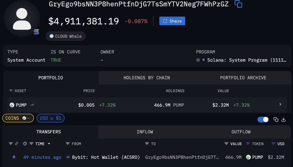 🔹 鲸鱼“GryEg”也首次从 #Bybit 提现了 4.669 亿 $PUMP(232 万美元)。