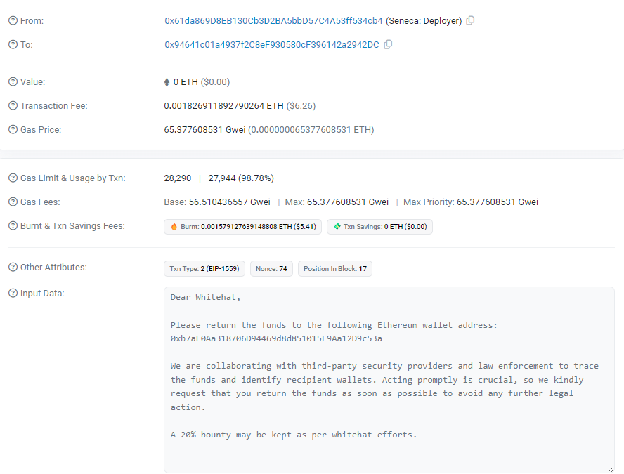 We're happy to see 80% of funds have been returned. Transaction link: https://t.co/VzqCvt24pF The exploit involved assets held in users' wallets. The exploit didn't involve funds directly deposited into Seneca (Seneca's TVL). The recovery of funds through a whitehat request… https://t.co/fA9a0sGJ4r
