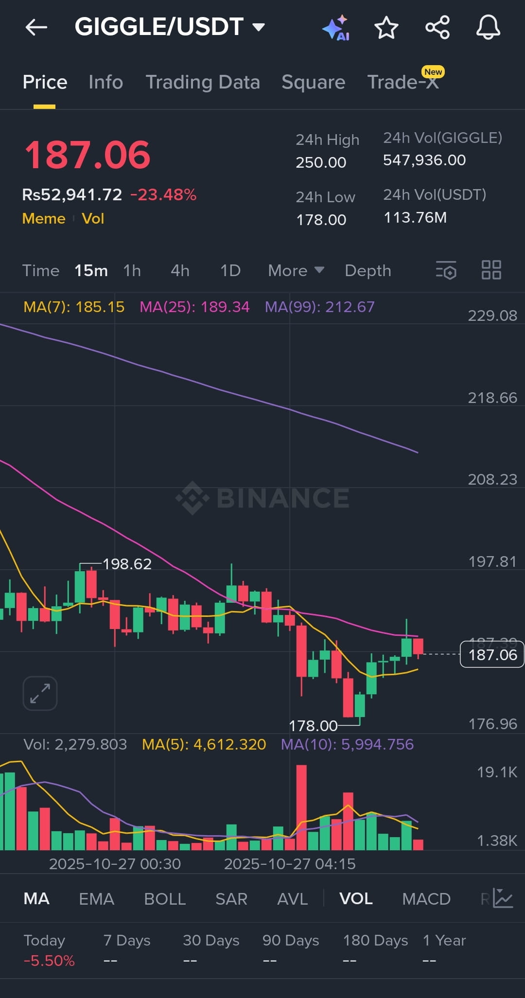 Price: $187.06 | 24-hour: -23.48%