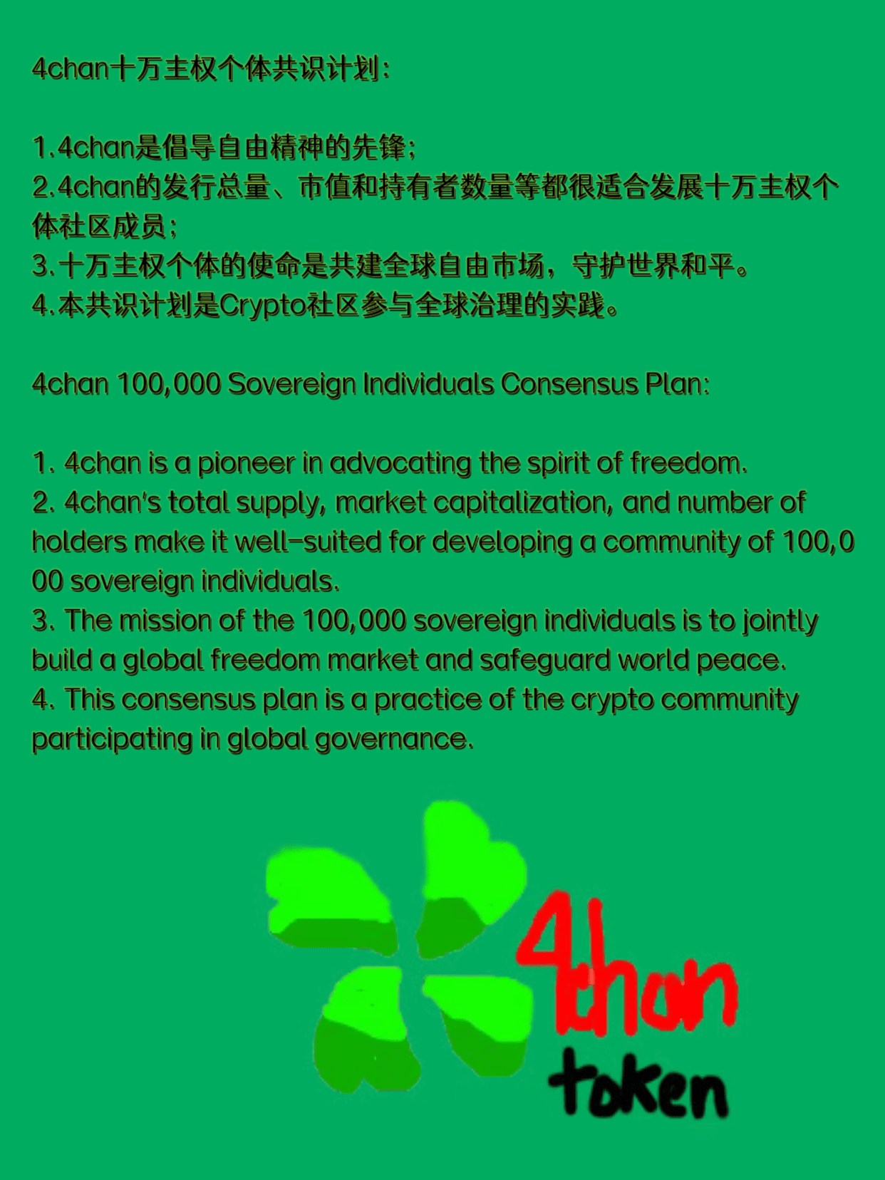 As a member of the #4chan community, I will be launching the 4chan Sovereign Individuals Peace and Development Think Tank, which will transcend the scope of nations and other think tanks to become a new type of think tank promoting world peace and development. Those in the crypto space with vision and who support this cause, please hold $4chan. The 4chan Sovereign Individuals Peace and Development Think Tank will officially launch when $4chan's market capitalization exceeds $1 billion.
