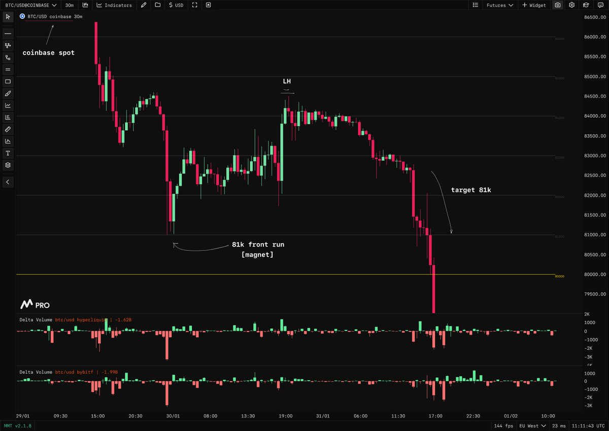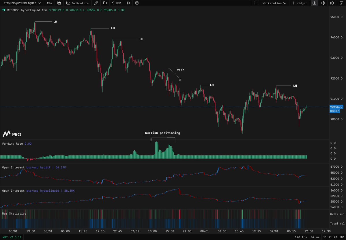 > Price decline > Financing rates surge > Price barely rebounds This series of events = absorption Long positions failed to drive prices up, and the downtrend continues.