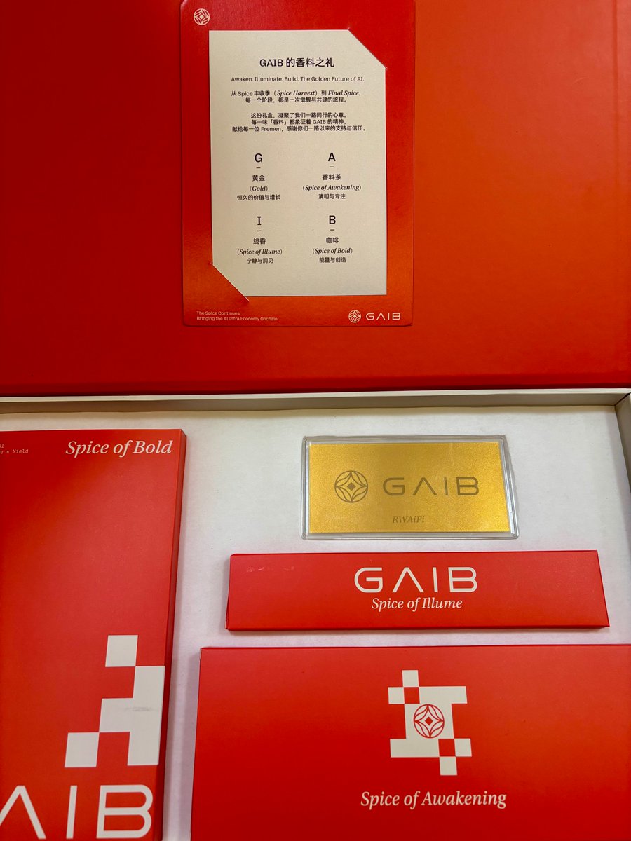收到 @gaib_ai 送的香料之礼🙇 在金价持续走高的情况下收到黄金还有香料茶、线香和咖啡特别开心,感谢 GAIB 团队的用心,这不仅是一份礼盒,而是一份共鸣、一种信号。 很荣幸能参与到这一场觉醒与重塑的征途之中,旅程,才刚刚开始。#GAIB #Web3