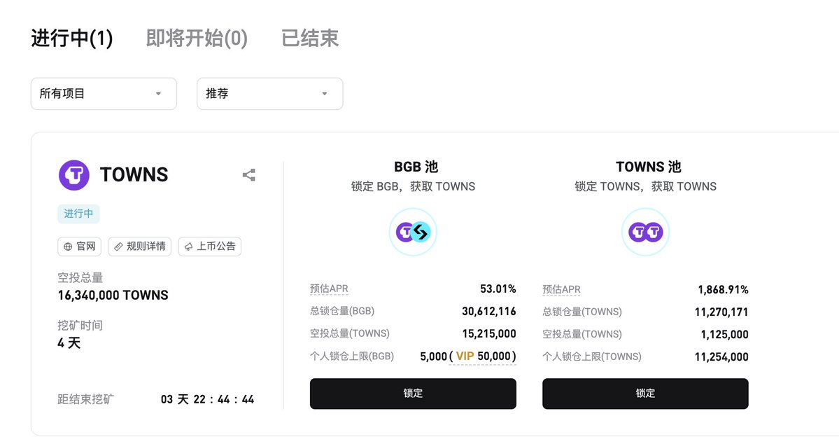 挖挖挖,新一期的Lauchpool来了~ 挖 $TOWNS 支持 #Bgb 和 $Towns 双币挖矿 Bgb 预估APR 53% ,Towns 预估APR 1869%
